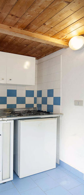 Realizzati in muratura e di forma ottagonale, sono costituiti da una spaziosa camera con letto matrimoniale e due letti singoli (a castello), un comodo bagno ed all'ingresso troviamo la zona living con angolo cottura coperto. I bungalows monolocali possono ospitare da 2 a 4 persone.